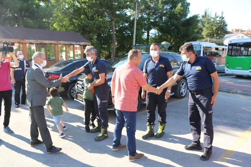 Karşılama töreninde konuşan Bolu Belediye Başkanı Tanju Özcan, 3 itfaiyeciye de Bolu halkı adına teşekkür ederek, “Çok teşekkür ediyoruz Bolu halkı adına, Türk milleti adına. Çok büyük gayretlerinizin olduğunu biliyorum. 60 civarında arama-kurtarma çalışmasına katılmışsınız. Allah razı olsun sizlerden” dedi.