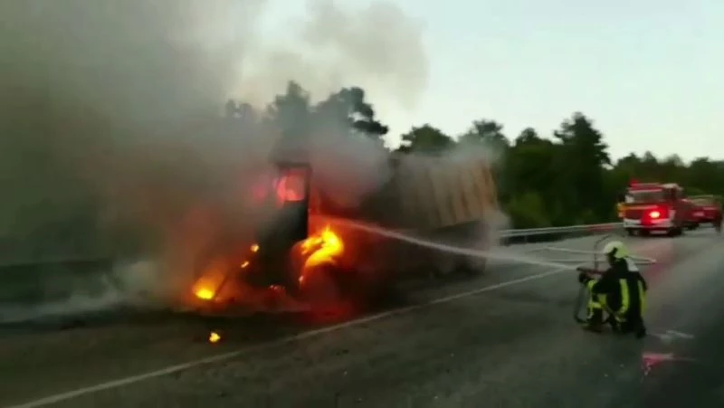 Denizli’nin Çameli ilçesinde seyir halindeyken motor kısmından alev alarak bomba gibi patlayan kamyonun görüntüleri ortaya çıktı.
