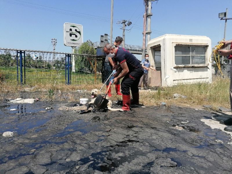 Boş araziye dökülen zifte saplanan köpeği itfaiye kurtardı