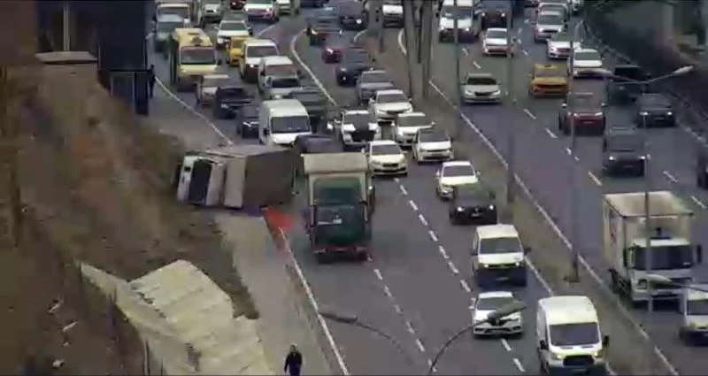 Boya yüklü kamyonet E-5’te yan yattı, yoğun trafik oluştu