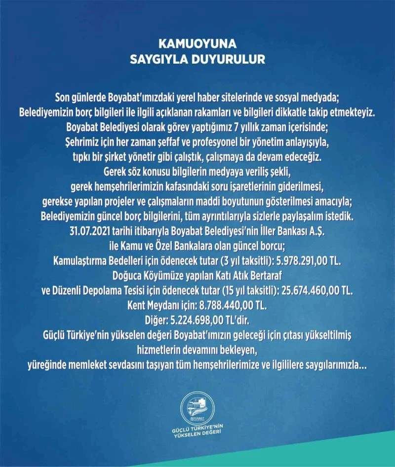 Yapılan açıklamada, “Son günlerde Boyabat’ımızdaki yerel haber sitelerinde ve sosyal medyada; belediyemizin borç bilgileri ile ilgili açıklanan rakamları ve bilgileri dikkatle takip etmekteyiz. Boyabat Belediyesi olarak görev yaptığımız 7 yıllık zaman içerisinde; şehrimiz için her zaman şeffaf ve profesyonel bir yönetim anlayışıyla, tıpkı bir şirket yönetir gibi çalıştık, çalışmaya da devam edeceğiz. Gerek söz konusu bilgilerin medyaya veriliş şekli, gerek hemşehrilerimizin kafasındaki soru işaretlerinin giderilmesi, gerekse yapılan projeler ve çalışmaların maddi boyutunun gösterilmesi amacıyla; belediyemizin güncel borç bilgilerini, tüm ayrıntılarıyla sizlerle paylaşalım istedik” denildi.