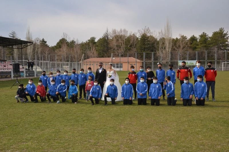 Kayseri’de futbol antrenörlüğü yapan Hasan Yuvacı, nikahını futbol sahasında yetiştirdiği sporcularla beraber kıydırdı.