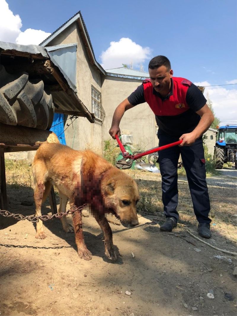 Ağrı’nın merkeze bağlı Yukarı Küpkıran köyünde boynu zincire sıkışan köpek, itfaiye ekipleri tarafından kurtarıldı.