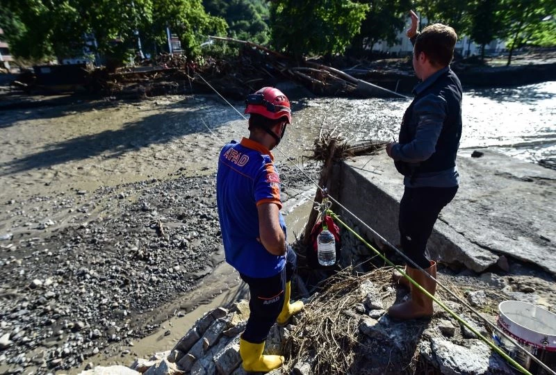 Kastamonu’nun Bozkurt ilçesinde sel suları sebebi ile ulaşımın kesildiği mahallede evlerini terk etmek istemeyen vatandaşlara, gıda ve temizlik malzemeleri derenin iki ucuna ip gerdirilerek ulaştırıldı.