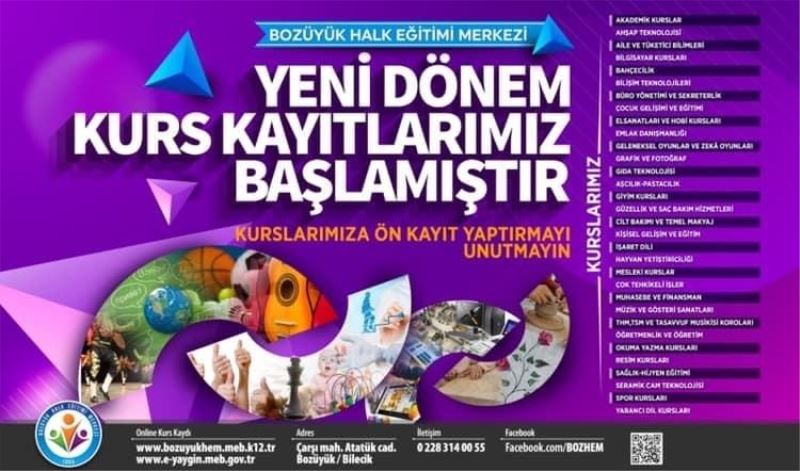 Bilecik’in Bozüyük İlçe Halk Eğitimi Merkezi’nde (HEM) 2020-2021 eğitim öğretim yılı yeni dönem kurs kayıtlarının başladığı açıklandı.