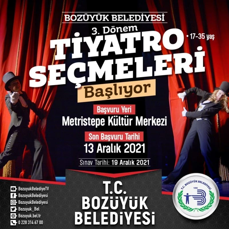 Bozüyük Belediyesi bünyesinde 2019 yılında kurulan Bozüyük Belediye Tiyatrosu (BBT), 3’üncü dönem tiyatro seçmeleri başlıyor.