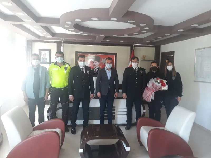 Ziyarette, bayan polis memuru Nilgün Bahar, Kaymakam Yılmaz’a çiçek verdi.