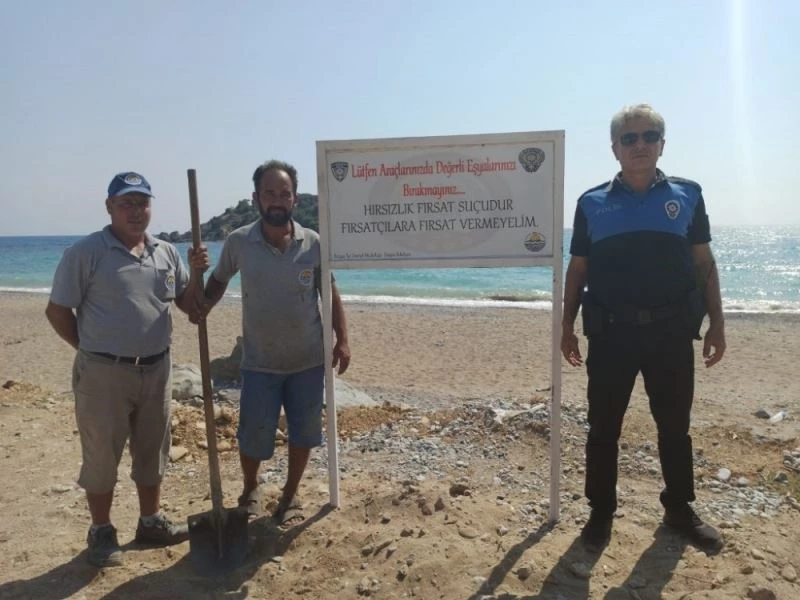 Mersin’in Bozyazı ilçesinde polisler, vatandaşları hırsızlık ve dolandırıcılık olaylarına karşı uyarıp, yol kenarlarına ve sahillere uyarıcı levhalar koydu.
