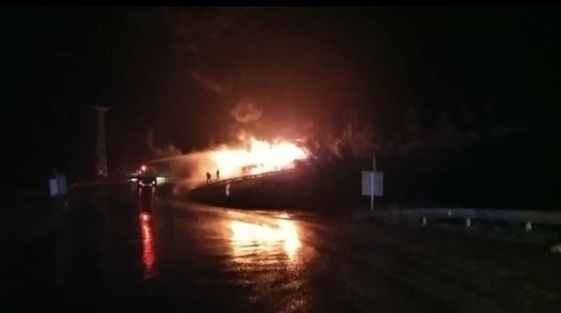 Mersin’in Bozyazı ilçesinde D-400 Karayolunda seyir halindeki bir tırda henüz belirlenemeyen bir nedenle yangın çıktı. Alev topuna dönen tır, itfaiye ekiplerinin müdahalesi ile söndürüldü.