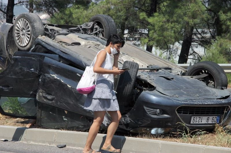 Muğla’da önündeki araca çarparak takla atan araç sürücüsü kadın ve yanındaki yolcu kazadan burnu bile kanamadan kurtuldu.