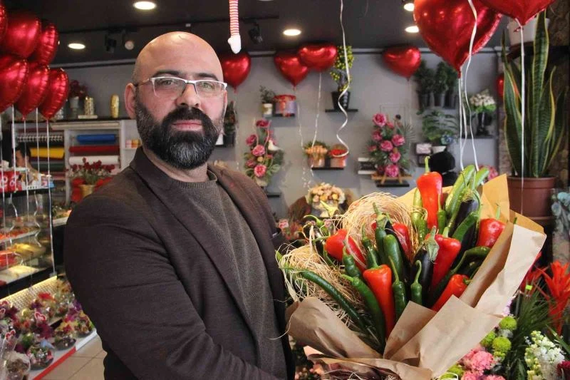 Karaman’da bir çiçekçi esnafının 14 Şubat Sevgililer Günü’nde farklılık olsun diye biber, salatalık ve patlıcandan yaptığı buketi görenleri şaşırtıyor.