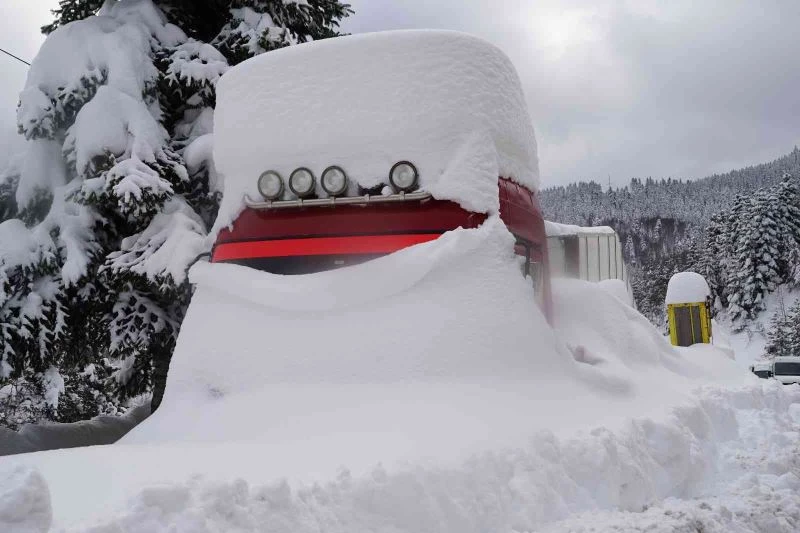 Kastamonu’nun Küre ilçesinde etkili olan yağış sonrasında kar kalınlığı 2 metreye kadar ulaştı. Tırların dahi kar altında kaybolduğu ilçede, hayat durma noktasına geldi.