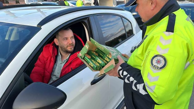 Düzce’de trafik polislerinin yaptığı uygulamaya takılan vatandaşlara bisküvi, hurma ve su ikram edildi.