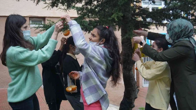 Edirne’de Mimar Sinan Ortaokulu öğretmen ve öğrencileri, portakal kabuğu ve yağ tenekelerinden yaptıkları yemlikleri ağaç dallarına asarak hem kuşların soğuk kış günlerinde aç kalmasını engelliyor, hem de değerlendirdikleri atıklarla sürdürülebilir bir çevre anlayışına dikkat çekiyor.