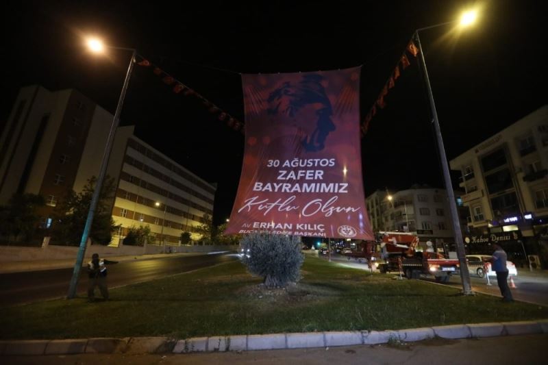 Ulu Önder Mustafa Kemal Atatürk’ün başlattığı, Kurtuluş Savaşının zafere ulaştığı 30 Ağustos Zafer Bayramının 98’inci yıl dönümü için Buca’da hazırlıklar başladı. 30 Ağustos coşkusunu tüm ilçeye yaymak için çalışan Buca Belediyesi, kentin cadde ve sokaklarını dev Atatürk posteri ve Türk bayraklarıyla donattı. Trafik yoğunluğu oluşturmamak adına gece saatlerinde vinç eşliğinde çalışma yapan ekipler, kentin ana arterleri olan Doğuş ve Menderes Caddelerini boyu 5 metreye varan bayraklarla renklendirdi.