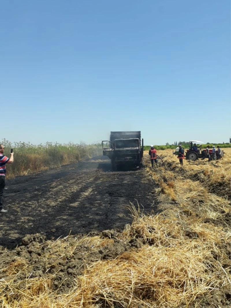 Alınan bilgiye göre, Karsavran Mahallesi’nde M.B. idaresindeki 33 N 8877 plakalı kamyonda, buğday hasadı yapıldığı sırada henüz bilinmeyen bir nedenle yangın çıktı. Kamyon alev alev yanarken, çevredekiler kendi imkanlarıyla söndürmeye çalıştı.