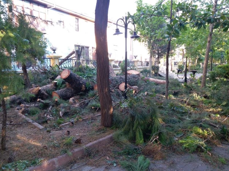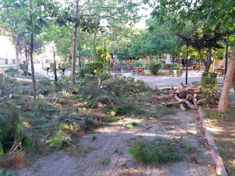 Buldan Belediyesi, bir gerekçe göstermeden Nuri Akın Parkı’nda bulunan yaklaşık 80 yıllık olduğu tahmin edilen çam ağaçlarını kesti.