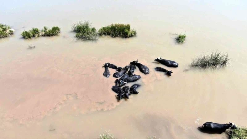 Türkiye genelinde yaşanan sıcak hava dalgası insanlar kadar hayvanları da etkiliyor. Sivas’ta sıcaklardan bunalan mandalar, kendilerini Türkiye’nin en uzun ırmağı Kızılırmak’a atarak serinliyor. Kalın deri yapısı nedeniyle sıcağı oldukça fazla hisseden mandalar, bu sayede hem ferahlıyor hem de temizleniyor. Afrika belgesellerini aratmayan mandaların serinlediği anlar renkli görüntülere sahne oluyor.