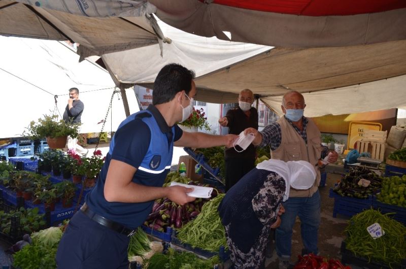 Zabıta ekipleri, ilçe merkezindeki vatandaşları maske takmaları ve sosyal mesafelerini korumaları yönünde de uyarırken, bugün Salı pazarı esnafına ve alışveriş yapmaya gelen vatandaşlara da ücretsiz maske dağıtıldı.