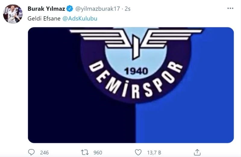 Kariyerini Fransa’da sürdüren milli futbolcu Burak Yılmaz, TFF 1. Lig 2020-2021 şampiyonu Adana Demirspor’u kutladı. Yılmaz, sosyal medya hesabından "Geldi efsane" paylaşımı yaparak Adana Demirspor’u etiketledi.