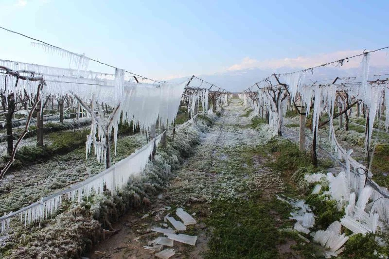Manisa’nın Alaşehir ilçesinde mart ayı gelmesine rağmen hava sıcaklıkları sıfırın altında seyretmeye devam ediyor. Özellikle gece yarısından sabaha karşı sıcaklıkların daha da düşmesi, dünyaca ünlü çekirdeksiz Sultani üzümün yetiştirildiği bağlarda da don tehlikesini meydana getiriyor. Don tehlikesine karşı bazı çiftçiler yağmurlama sistemiyle bağlarını sulayarak asmaların zarar görmesinin önüne geçmek isterken, su verilen bağlarda buz sarkıtları oluştu. İlginç görüntülere sahne olan bağlardaki buz sarkıtları adeta Sibirya’yı andırdı.
