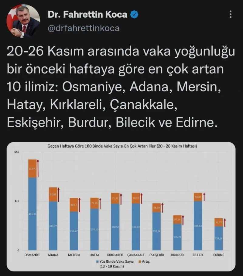 "20-26 Kasım arasında vaka yoğunluğu bir önceki haftaya göre en çok artan 10 il: Osmaniye, Adana, Mersin, Hatay, Kırklareli, Çanakkale, Eskişehir, Burdur, Bilecik ve Edirne."