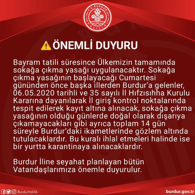 Vali Şıldak, önemli duyuru başlığıyla yaptığı paylaşımda, "Bayram tatili süresince ülkemizin tamamında sokağa çıkma yasağı uygulanacaktır. Sokağa çıkma yasağının başlayacağı Cumartesi gününden önce başka illerden Burdur’a gelenler, 6 Mayıs tarihli ve 35 sayılı İl Hıfzıssıhha Kurulu Kararına dayanılarak il giriş kontrol noktalarında tespit edilerek kayıt altına alınacak, sokağa çıkma yasağının olduğu günlerde doğal olarak dışarıya çıkamayacakları gibi ayrıca toplam 14 gün süreyle Burdur’daki ikametlerinde gözlem altında tutulacaklardır. Bu kuralı ihlal etmeleri halinde ise bir yurtta karantinaya alınacaklardır. Burdur iline seyahat planlayan bütün vatandaşlarımıza önemle duyurulur" ifadelerine yer verdi.