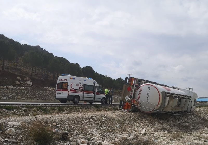 Burdur-Fethiye karayolunda akaryakıt tankeri kontrolden çıkarak şarampole devrildi, araç sürücüsü yaralandı.