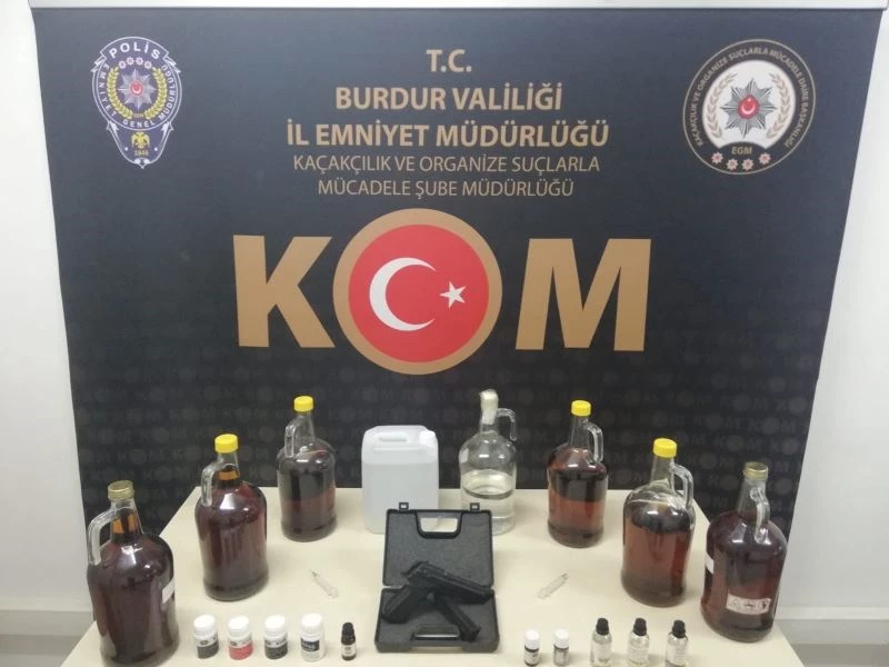 Burdur İl Emniyet Müdürlüğü ekiplerince, kaçakçılık suçlarının önlenmesi, takibi, men edilmesi amacıyla çalışma yürütüldü. Çalışmalar çerçevesinde İl Emniyet Müdürlüğü ekiplerince kent merkezinde A.R.Ç. isimli şahsın el yapımı alkol sattığı tespit edildi. Şahsın işyeri ve ikametinde yapılan aramada; 7 adet cam şişe içerisinde 26,4 litre el yapımı alkol, üzerinde herhangi bir ibare bulunmayan plastik bidon içerisinde 4,2 litre etil alkol, 10 adet şişe içerisinde aroma kitleri, 1 adet kuru sıkı tabanca ele geçirildi. Şahıs hakkında 5607 Sayılı Kaçakçılıkla Mücadele Kanununa Muhalefet ve 6136 Sayılı Kanuna Muhalefet suçundan işlem yapıldı.