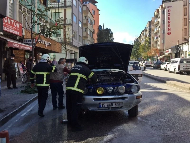 Burdur’da park halindeyken motor kısmından alev alan araç, çevredeki esnaf ve itfaiyenin müdahalesi sonucu söndürüldü.