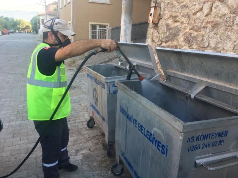 Burhaniye Belediyesi, karasinek ve uçkunlara yönelik çöp konteynırlarını temizleyerek ilaçlamalarını yapıyor. Yapılan çalışmayla sinek larvaları yok edilerek üremeleri önleniyor.