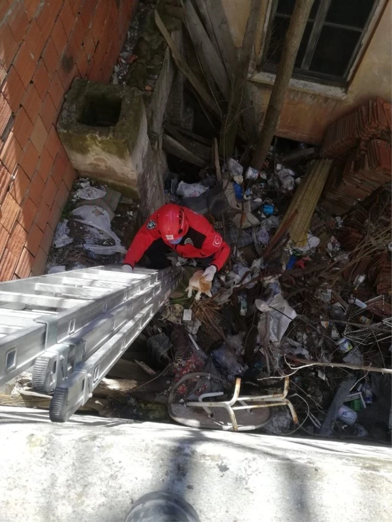 Burhaniye ilçesinde, apartman boşluğunda mahsur kalan kediyi itfaiye kurtardı.