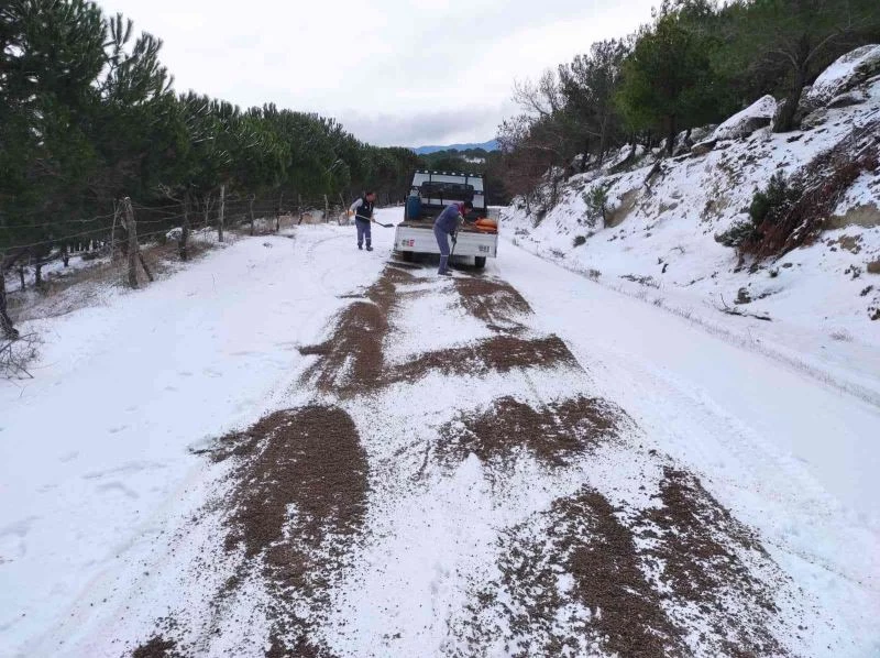 Balıkesir’in Burhaniye ilçesinde buzlanma riski olan karla kaplı köy yollarında tuzlama çalışmaları yapılıyor.