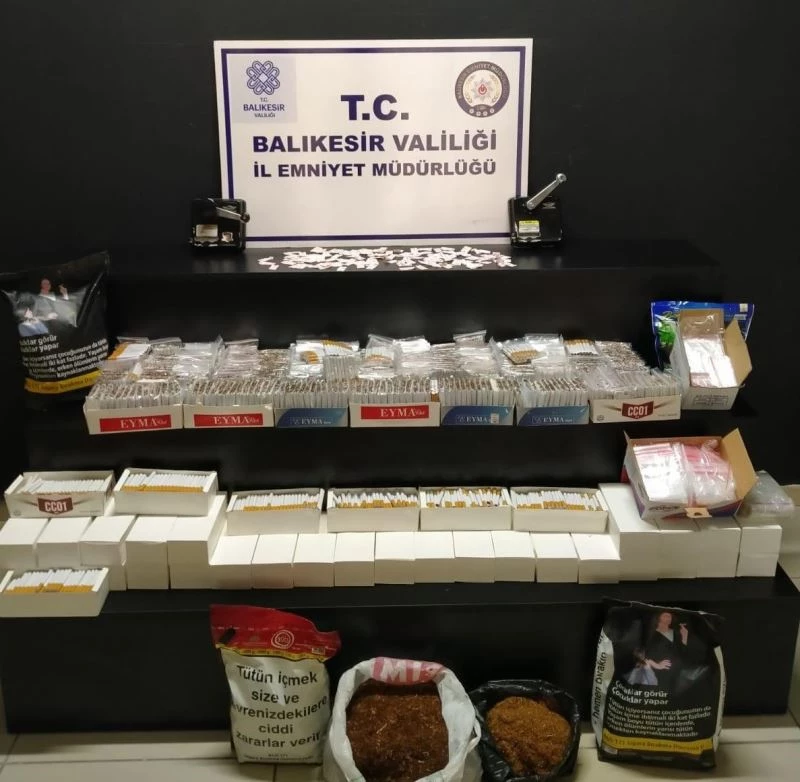 Edinilen bilgiye göre, Balıkesir İl Emniyet Müdürlüğü Kaçakçılık ve Organize Suçlarla Mücadele Şube Müdürlüğü Edremit Kom Grup Amirliği ekipleri, ev ve iş yerlerine düzenlenen operasyonla 5bin 600 adet boş makaron, 8 bin 40 adet içi kıyılmış tütün doldurulmuş makaron, 5.5 Kg tütün, 2 adet sigara sarma makinesi, 147 adet TAPDK bandrolü ele geçirirken, olayla ilgili 2 şüpheli kişi ile ilgili olarak adli işleme başlandığı öğrenildi.