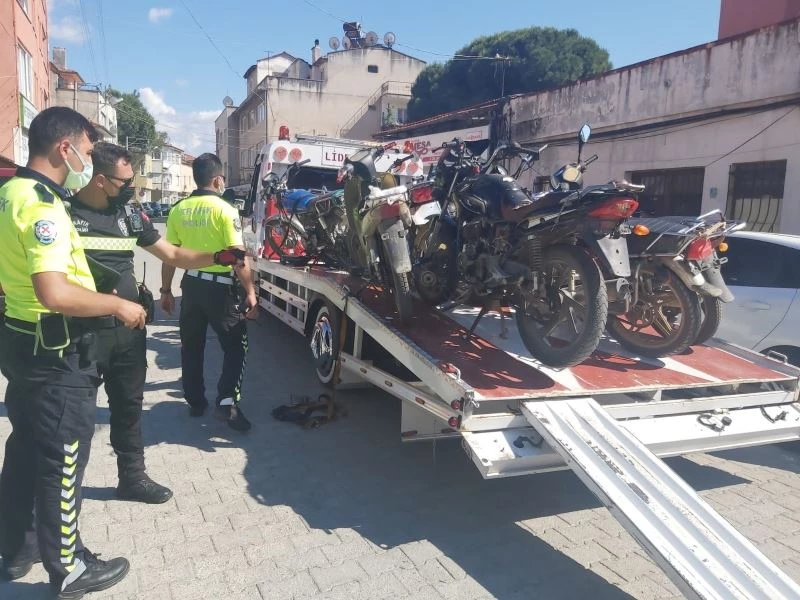 Burhaniye Emniyet Müdürlüğünde Trafik Büro Amiri Özgül Reçel başkanlığındaki ekipler trafik denetimlerini artırdı. Aralar ve motosikletler üzerinde başlatılan denetimler bütün hızıyla devam ederken, tescilsiz olan, abartılı egzoz kullanan ve kask takmayan sürücülere de aman verilmiyor. Ekipler, tescilsiz motosikletleri toplayarak yediemin deposuna gönderirken, bir motor hırsızı da çaldığı motosikletle birlikte yakalandı. Denetimlerin devem edeceğini anlatan ekipler, sürücüleri kurallara uymaya çağırdı.