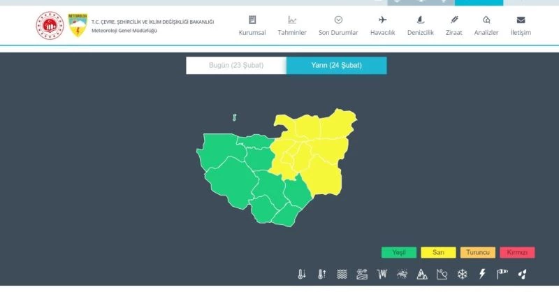 Öte yandan Bursa’nın 9 ilçesi, haritada sarı ile işaretlendi. Sarı renk, ’Hava durumu potansiyel tehlikelidir. Tahmin edilen meteorolojik hadise olağandışı olmamakla birlikte meteorolojik şartlardan etkilenebilecek faaliyetler konusunda dikkatli olunmalıdır’ uyarılarını kapsıyor.