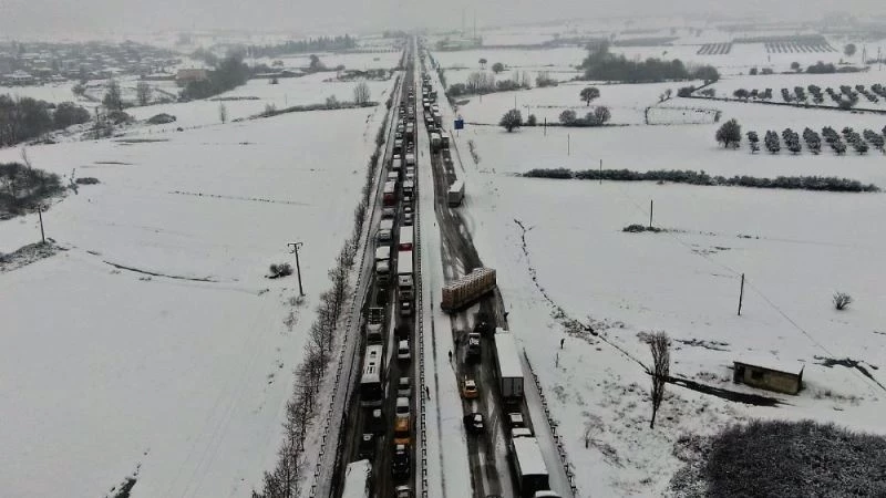 Bursa İzmir karayolu yoğun kar yağışı ve tipi sebebiyle trafiğe kapandı. Kazaların yaşanmasıyla çile bir kat daha arttı. Kilometrelerce kuyruk İHA ekibi tarafından drone ile havadan görüntülendi