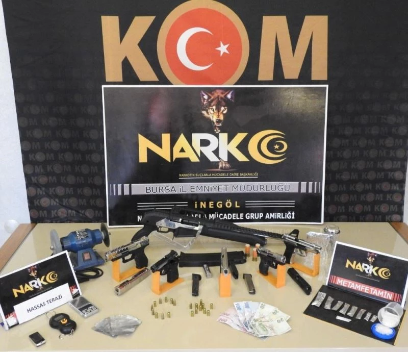 Edinilen bilgilere göre, İnegöl Narkotik Suçlarla Mücadele ve KOM Grup Amirliği ekipleri uyuşturucu ve silah ticaretinin önlenmesine yönelik ortak yapılan çalışmalar kapsamında, Ertuğrulgazi Mahallesi’nde H.Y. isimli şahsın ikametinde uyuşturucu ve silah satışı yaptığı bilgisi üzerine bahse konu adres takibe aldı. Bu sırada ikamete gelen Ü.T. isimli şahıs yakalandı, şahsın üzerinde yapılan aramada 1,09 gram metamfetamin maddesi ele geçirildi. Maddenin H.Y. isimli şahıstan aldığı tespit edilirken, yine aynı adrese gelen M.G. isimli şahıs yakalandı, şahsın üzerinde yapılan aramada 8,10 gram metanfetamin maddesi ele geçirildi. M.G’nin de maddeleri H.Y. isimli şahıstan aldığı tespit edildi.