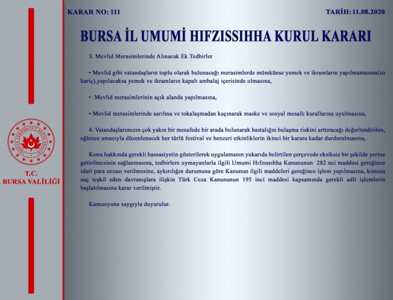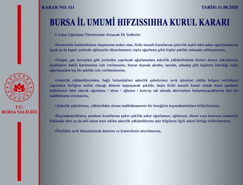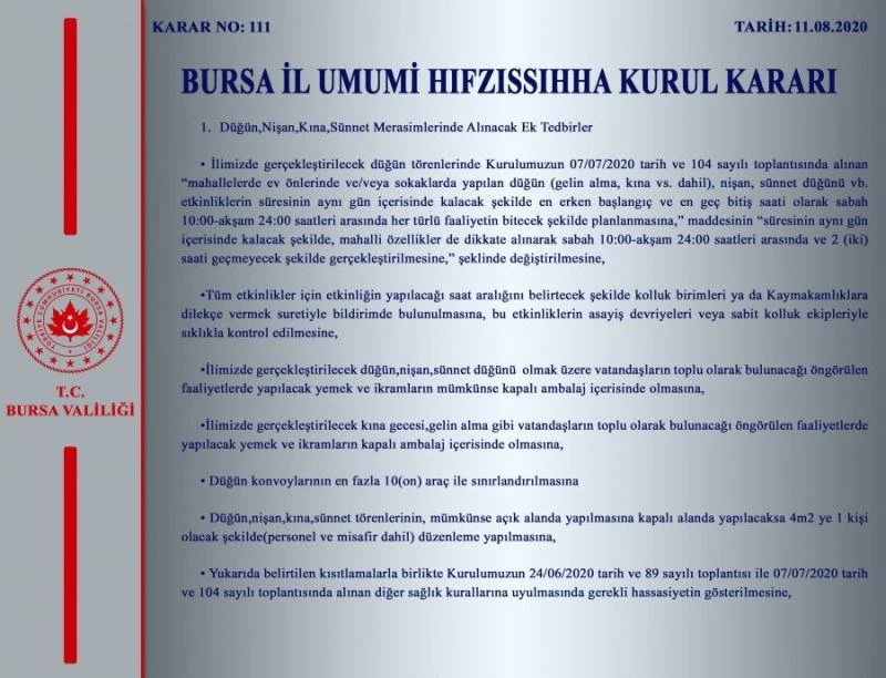 Ancak gelinen noktada düğünler ve mevlidler ile asker uğurlama törenlerinde/eğlencelerinde ek tedbirler alınması zorunluluğu ortaya çıkmıştır. Bu kapsamda; il Hıfzıssıhha Kurulumuzun 11.08.2020 tarih ve 111 sayılı kararı ile;