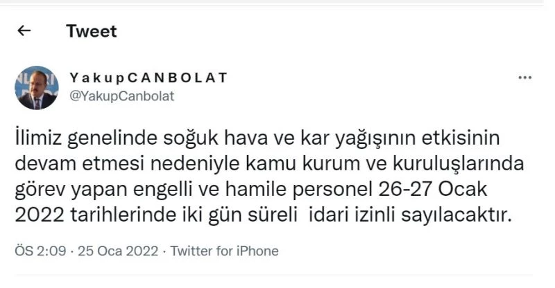 Bursa Valisi Canbolat’ın sosyal medya hesabından yaptığı açıklamada, "İlimiz genelinde soğuk hava ve kar yağışının devam etmesi sebebiyle kamu kurum ve kuruluşlarında görev yapan engelli ve hamile personel, 26-27 Ocak 2022 tarihlerinde iki gün idarî izinli sayılacaktır" ifadelerini kullandı.