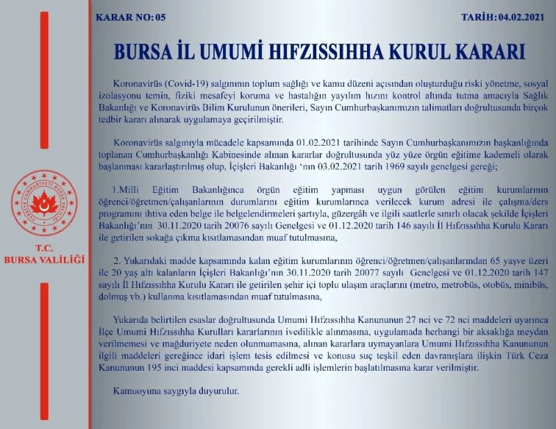 Bursa Valiliği İl Hıfzıssıhha Kurulu yeni tip korona virüs (Covid-19) tedbirleri kapsamında alınan yeni kararları duyurdu.