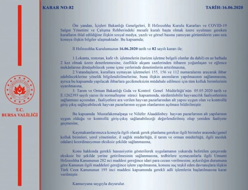 3. Tarım ve Orman Bakanlığı Gıda ve Kontrol Genel Müdürlüğü’nün 05.05.2020 tarih ve E.1262393 sayılı yazısı ile normalleşme süreci kapsamında, sürdürülebilir hayvancılık faaliyetlerinin sağlanması açısından, faaliyetlere ara verilen hayvan pazarlarından alt yapısı uygun olan ve kontrollü giriş çıkış sağlayabilecek hayvan pazarlarının uygun olanlarının açılması bildirilmiştir. Bu kapsamda Mustafakemalpaşa ve Nilüfer Alaaddinbey hayvan pazarlarının alt yapılarının uygun olduğu ve kontrollü giriş-çıkış sağlanabileceği değerlendirilmiş olup yeniden faaliyete geçmesine,Kaymakamlarımızca konuyla ilgili olarak gerek planlama gerekse ilgili birimler arasında (genel kolluk birimleri, yerel yönetimler, il sağlık müdürlüğü, il tarım ve orman müdürlüğü, ilgili meslek odaları) koordinasyonun eksiksiz şekilde sağlanmasına, konu hakkında gerekli hassasiyetin gösterilerek uygulamanın yukarıda belirtilen çerçevede eksiksiz bir şekilde yerine getirilmesinin sağlanmasına, tedbirlere uymayanlarla ilgili Umumi Hıfzıssıhha Kanununun 282’nci maddesi gereğince idari para cezası verilmesine, aykırılığın durumuna göre Kanunun ilgili maddeleri gereğince işlem yapılmasına, konusu suç teşkil eden davranışlara ilişkin Türk Ceza Kanununun 195’inci maddesi kapsamında gerekli adli işlemlerin başlatılmasına karar verilmiştir."