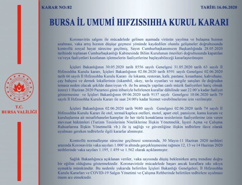 "Korona virüs salgını ile mücadelede gelinen aşamada virüsün yayılma ve bulaşma hızının azalması, vaka artış hızının düşüşe geçmesi yönünde kaydedilen olumlu gelişmeler doğrultusunda kontrollü sosyal hayat sürecine geçilmiş, Sayın Cumhurbaşkanımızın başkanlığında 28.05.2020 tarihinde toplanan Cumhurbaşkanlığı Kabinesinde Bilim Kurulunun önerileri doğrultusunda kapatılan ve/veya faaliyetleri kısıtlanan işletmelerin faaliyetlerine başlayabileceği kararlaştırılmıştır. İçişleri Bakanlığının 30.05.2020 tarih 8556 sayılı Genelgesi 31.05.2020 tarih 63 sayılı İl Hıfzıssıhha Kurulu kararı, İçişleri Bakanlığının 02.06.2020 tarih 8591 sayılı Genelgesi 02.06.2020 tarih 66 sayılı İl Hıfzıssıhha Kurulu Kararı ile lokanta, restoran, kafe, pastane, kıraathane, kahvehane, çay bahçesi ve dernek lokallerinin (iskambil, okey, tavla oyunları ve nargile satışları ile doğrudan temasa neden olacak şekilde dans/oyun vb. ile bu amaçla yapılan canlı müzik faaliyetleri hariç olmak üzere) 1 Haziran 2020 Pazartesi günü itibariyle belirlenen kurallar dahilinde saat 22.00’a kadar faaliyet göstermesine ve İçişleri Bakanlığının 09.06.2020 tarih 9137 sayılı Genelgesi 10.06.2020 tarih 79 sayılı İl Hıfzıssıhha Kurulu Kararı ile saat 24.00’e kadar hizmet verebilmelerine izin verilmiştir. İçişleri Bakanlığının 02.06.2020 tarih 9680 sayılı Genelgesi 02.06.2020 tarih 74 sayılı il Hıfzıssıhha Kurulu Kararı ile otel, termal/kaplıca otelleri, motel, apart otel, pansiyon, kamu kurum ve kuruluşlarına ait misafirhaneler/kamplar ile her türlü konaklama tesislerinin faaliyetlerine izin veren mevzuat hükümleri (Turizm Tesislerinin Niteliklerine İlişkin Yönetmelik, İşyeri Açma ve Çalışma Ruhsatlarına İlişkin Yönetmelik vb.) ile iş sağlığı ve güvenliğine ilişkin tedbirlere ilave olarak uyulması gereken tedbirlerle ilgili kararlar alınmıştır. Kontrollü normalleşme sürecine geçilmesi sonrasında, 30 Mayıs-11 Haziran 2020 tarihleri arasında korona virüs vaka sayıları 1000’in altında gerçekleşmesine rağmen 12, 13 ve 14 Haziran 2020 tarihlerinde vaka sayıları 1195, 1459 ve 1562 olarak açıklanmıştır. Sağlık Bakanlığınca açıklanan veriler, vaka sayısında düşüş beklenirken artış trendine doğru bir eğilim olduğunu göstermektedir. Korona virüsle mücadelede başarı ancak kurallara sıkı sıkıya uymakla mümkündür. Bu nedenle yukarıda belirtilen İçişleri Bakanlığı Genelgeleri, İl Hıfzıssıhha Kurulu Kararları ve COVID-19 Salgın Yönetimi ve Çalışma Rehberinde belirtilen tedbirlere uyulması önem arz etmektedir. Öte yandan, İçişleri Bakanlığı Genelgeleri, İl Hıfzıssıhha Kurulu Kararları ve COVID-19 Salgın Yönetimi ve Çalışma Rehberindeki mesafe kuralı başta olmak üzere uyulması gereken kuralların ihlal edildiğine ilişkin sosyal medya, yazılı ve görsel basına yansıyan görüntülerin yanı sıra konuya ilişkin bilgiler ulaşmaktadır."