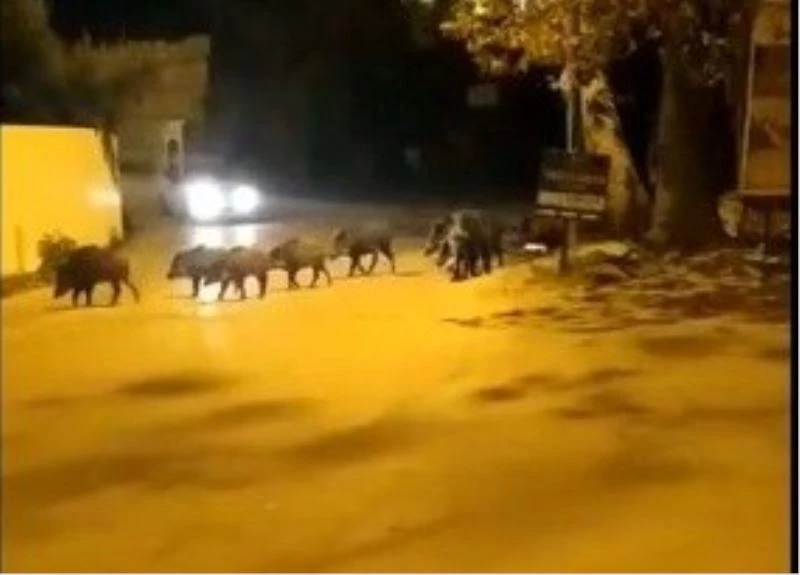 Bursa’da aç kalan domuz sürüsü yiyecek aramak için ilçe merkezine indi. Yoldan geçen bir vatandaş ise cep telefonuyla o anları kaydetti.