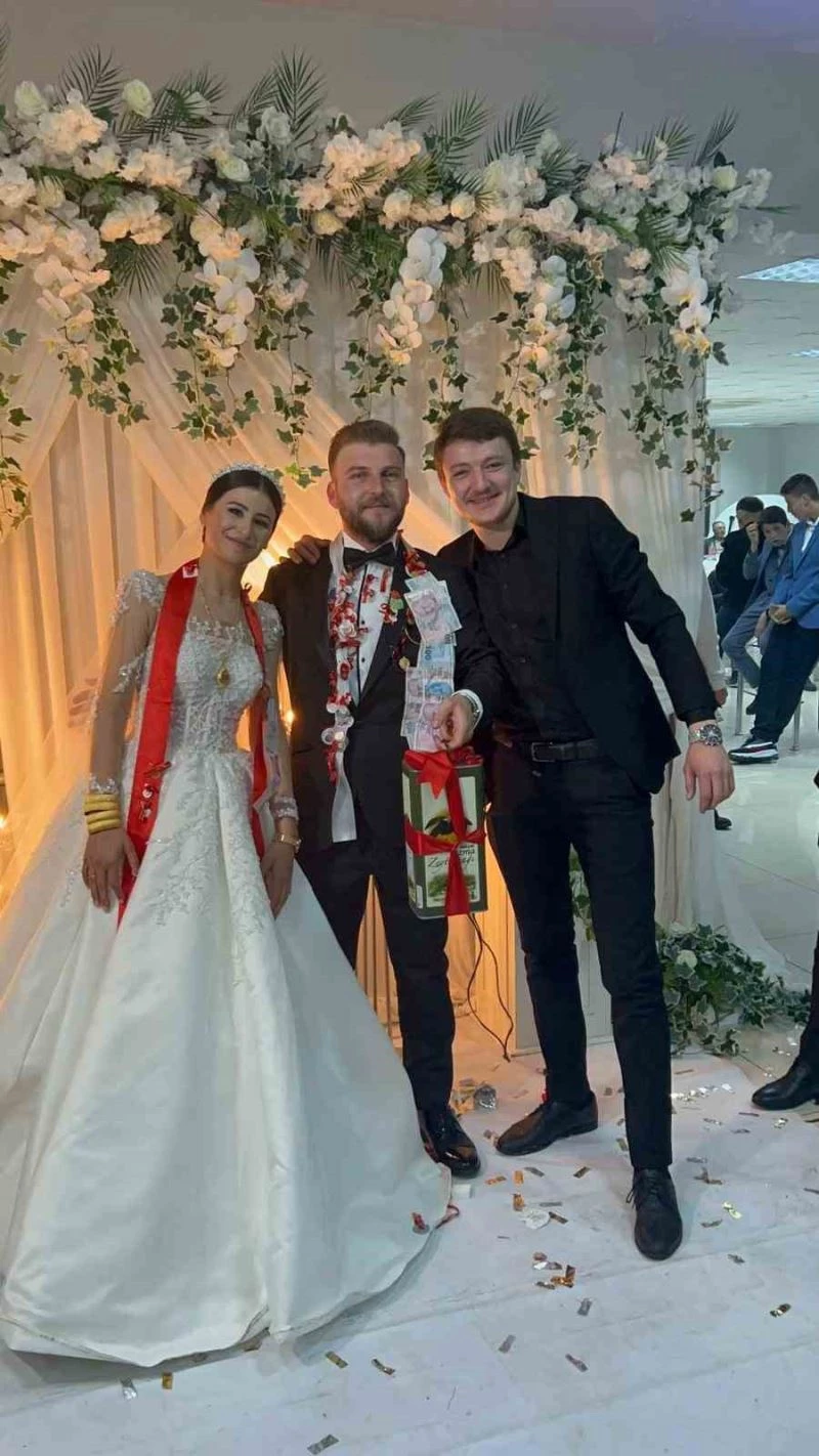 Bursa’nın İznik ilçesinde bir çiftin düğün merasiminde damada 5 litrelik teneke zeytinyağı takı olarak takıldı. Arkadaşların bu şakası damat ve gelini güldürdü.