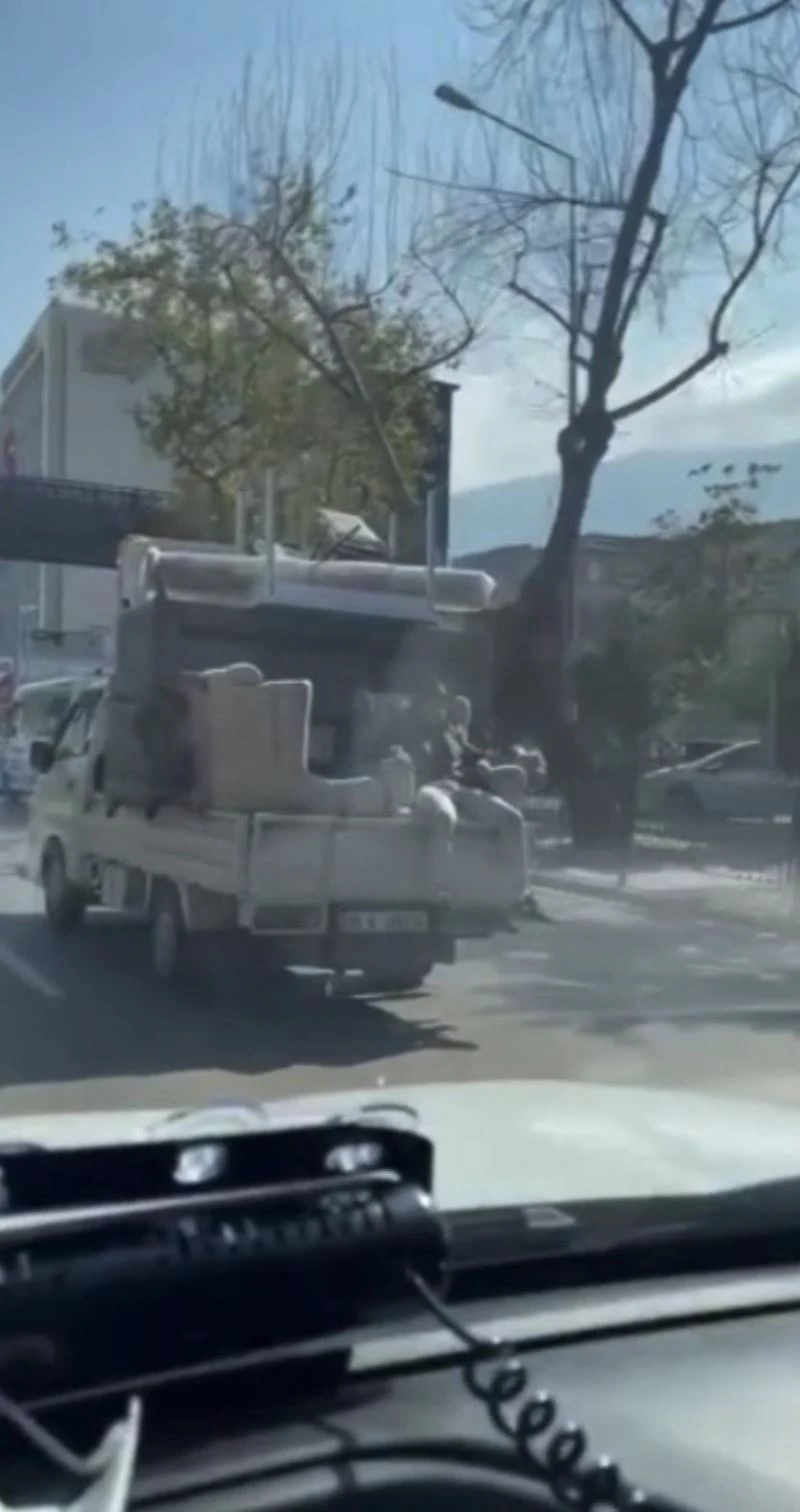 Edinilen bilgiye göre, kasasında eşya yüklü bir kamyonetin arkasında koltuğa oturan vatandaş, yürekleri ağza getirdi. Muhtemel bir faciaya davetiye çıkaran vatandaşın rahatlığı "pes" dedirtti. Bu anlar ise cep telefonu kamerasına saniye saniye yansıdı.