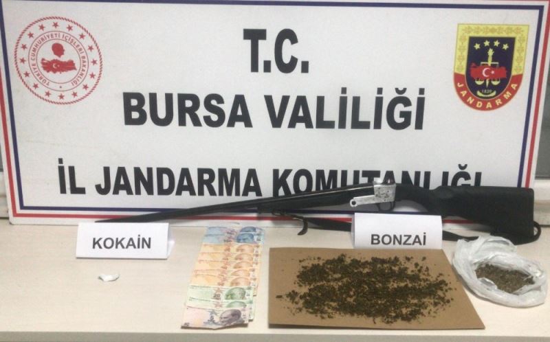 Şüphelinin ikametinde yapılan aramalar ise, 150 gram bonzai, 5 gram kokain, magnum marka 12 calibre ruhsatsız av tüfeği, uyuşturucu maddeden elde edildiği değerlendirilen 500 lira nakit ele geçirildi.