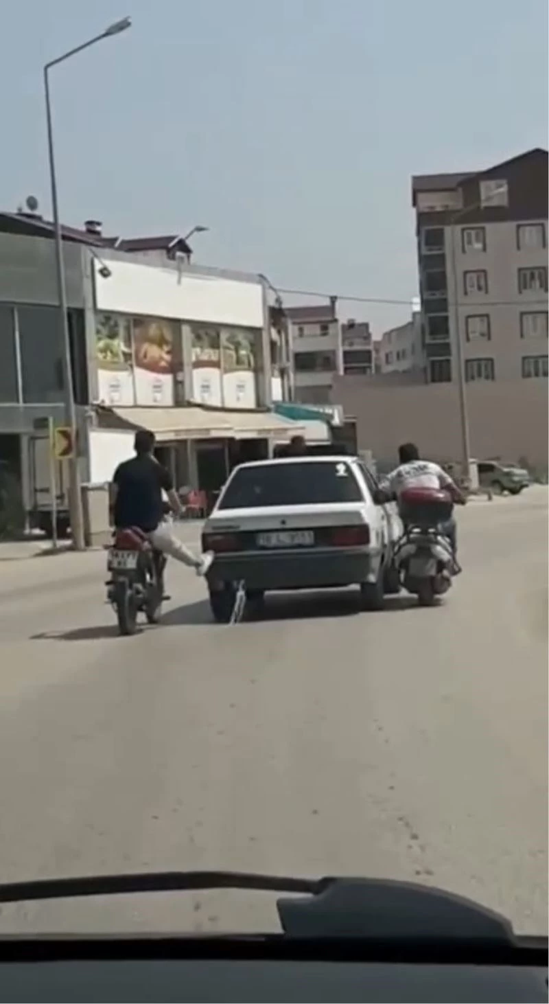 Olay, merkez Osmangazi ilçesi Demirtaş Mahallesi’nde meydana geldi. Edinilen bilgiye göre, bir otomobil henüz öğrenilemeyen bir sebeple yolda kaldı. Tesadüfen yoldan geçen 2 motosiklet sürücüsü ise otomobili el ve ayaklarıyla iterek tamirhaneye götürdüler. O ilginç anlar arkadan gelen başka bir otomobil sürücüsü tarafından kaydedildi.