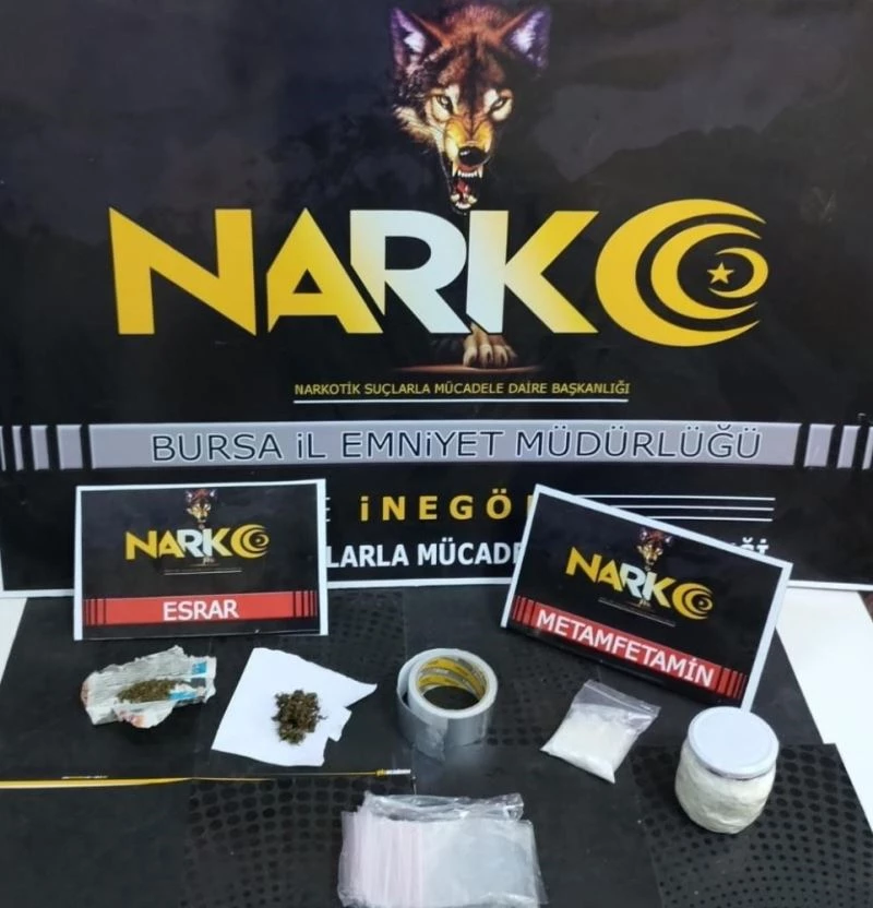 İnegöl Emniyet Müdürlüğüne bağlı KOM ve Narkotik Grup Amirliği ekipleri A.K. isimli şahsın uyuşturucu satıcılığı yaptığını belirledi. Ekipler şahsı takibe aldı. A.K. isimli şahıs takip edildiğini fark edince Sinanbey Mahallesi’nde elindeki çantayı atıp kaçmaya başladı. Nefes kesen kovalamaca sonucu şahıs kıskıvrak yakalanarak gözaltına alındı. Attığı çanta kontrol edildiğinde çanta içerisinde satışa hazır 68,19 gram metamfetamin maddesi ve 1 çıkı halinde 8,85 gram bonzai maddesi ile 1 adet hassas terazi ele geçirildi. Şahsın üzerinde uyuşturucu satışından elde edildiği düşünülen 765 TL para da ele geçirildi. A.K.’nin evinde de arama yapan ekipler, evde 12,45 gram esrar maddesi ve 40,90 gram metamfetamin maddesi ele geçirdi. Olayla ilgili soruşturma sürdürülüyor.