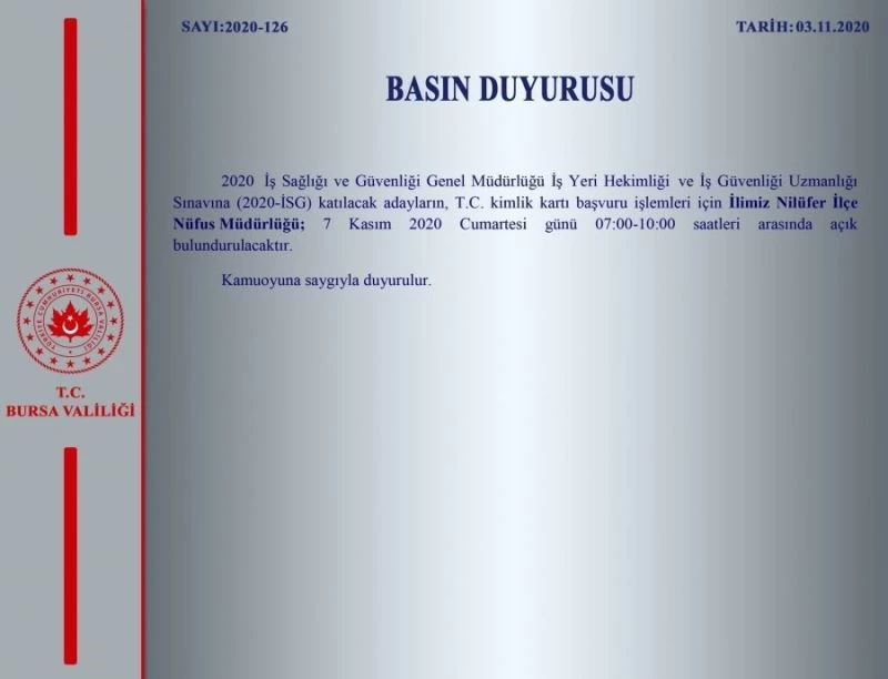 Bursa Valiliği’nden yapılan açıklamada, "2020 İş Sağlığı ve Güvenliği Genel Müdürlüğü İş Yeri Hekimliği ve İş Güvenliği Uzmanlığı Sınavına (2020-İSG) katılacak adayların, T.C. kimlik kartı başvuru işlemleri için İlimiz Nilüfer İlçe Nüfus Müdürlüğü; 7 Kasım 2020 Cumartesi günü 07:00-10:00 saatleri arasında açık bulundurulacaktır." ifadelerine yer verildi.